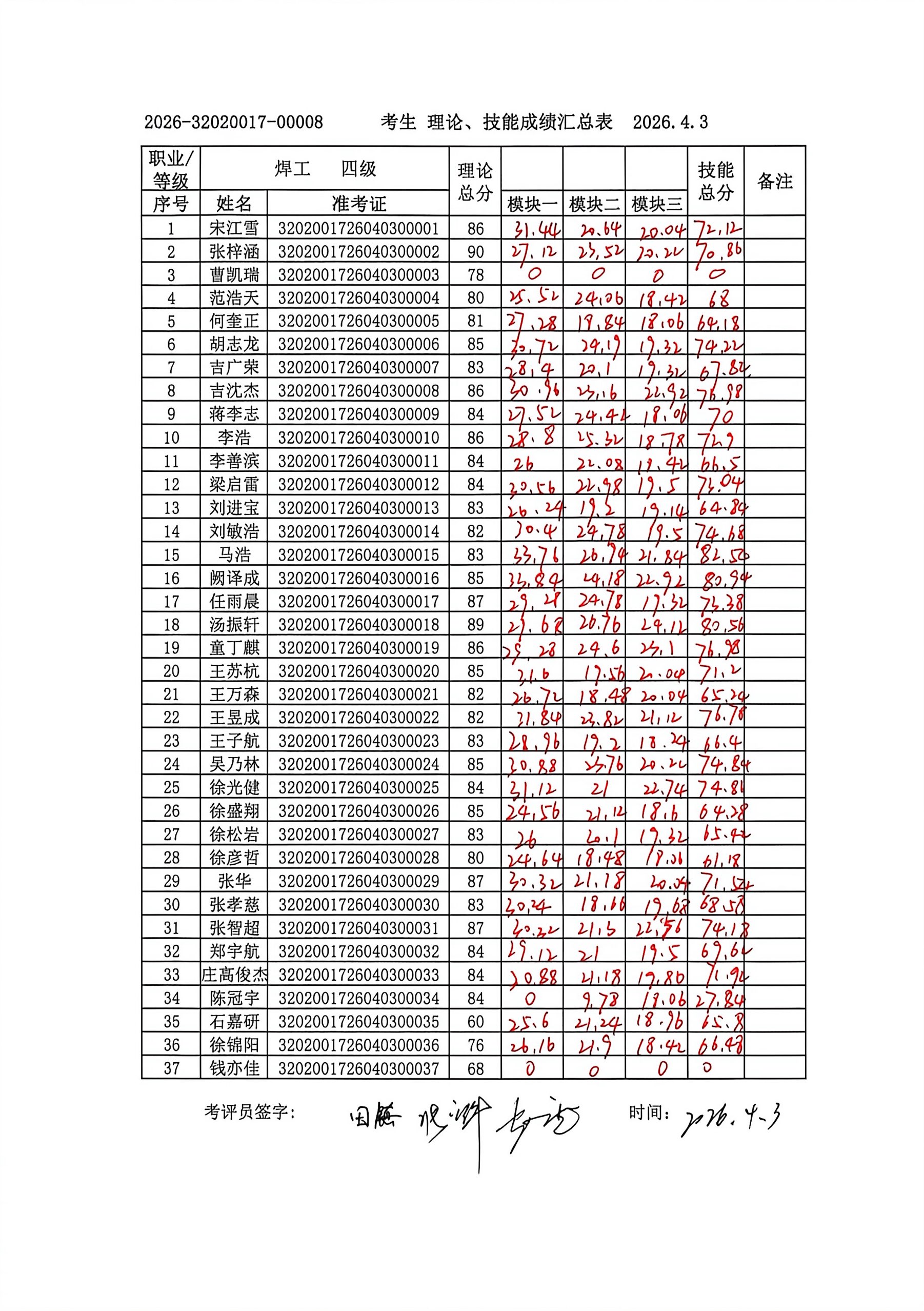 2026年4月焊工中级职业技能等级认定成绩公示