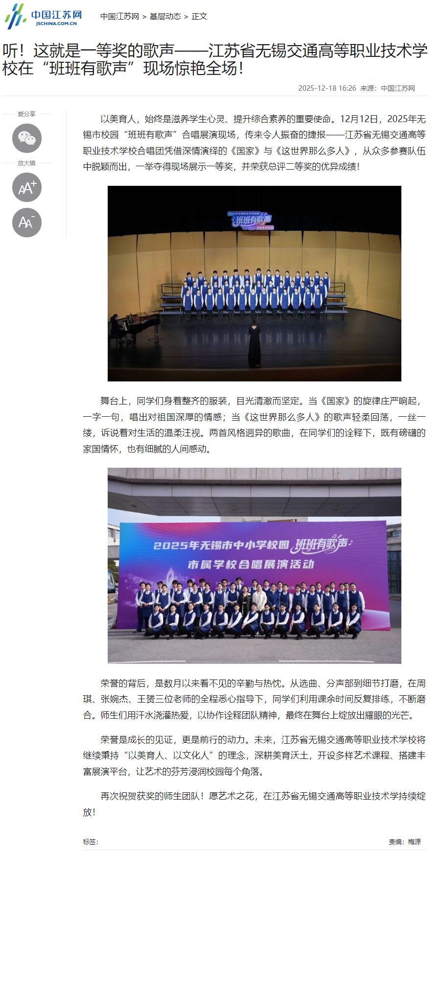 中江网:听!这就是一等奖的歌声——江苏省无锡交通高等职业技术学校在“班班有歌声”现场惊艳全场!