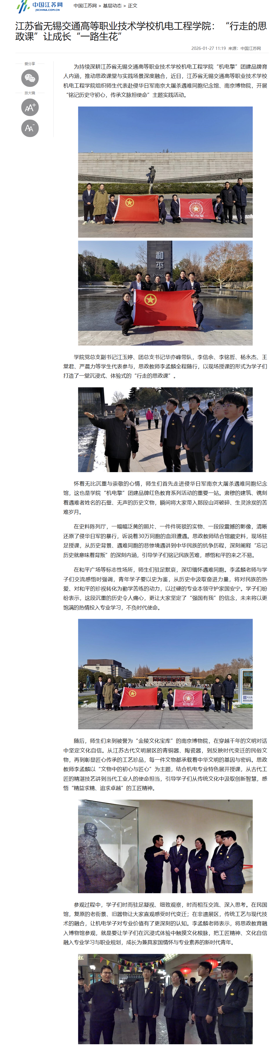 中江网:江苏省无锡交通高等职业技术学校机电工程学院:“行走的思政课”让成长“一路生花”