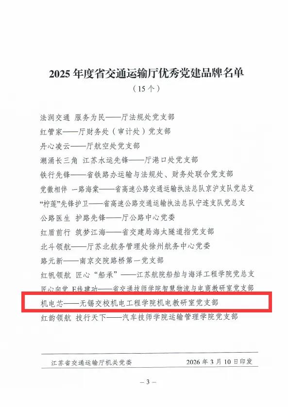 近日,江苏省交通运输厅通报表彰2025年度全厅“优秀党建品牌”。我校机电教研室党支部打造的“机电芯”党建品牌,以党建引领团建,融合“党建+专技+发展+服务”的特色,通过实践成效显著。该品牌在基层申报、集中展示、综合评定等环节中脱颖而出,成功获评,成为基层党建与团建、教科研、服务融合育人的典范。