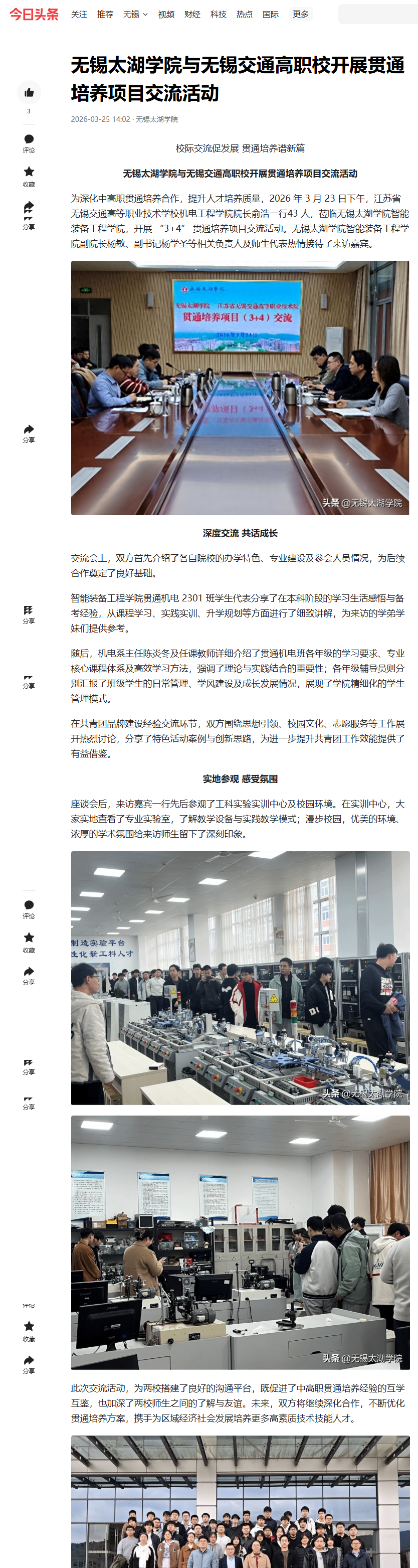 今日头条:江苏省无锡交通高等职业技术学校与无锡太湖学院开展贯通培养项目交流活动
