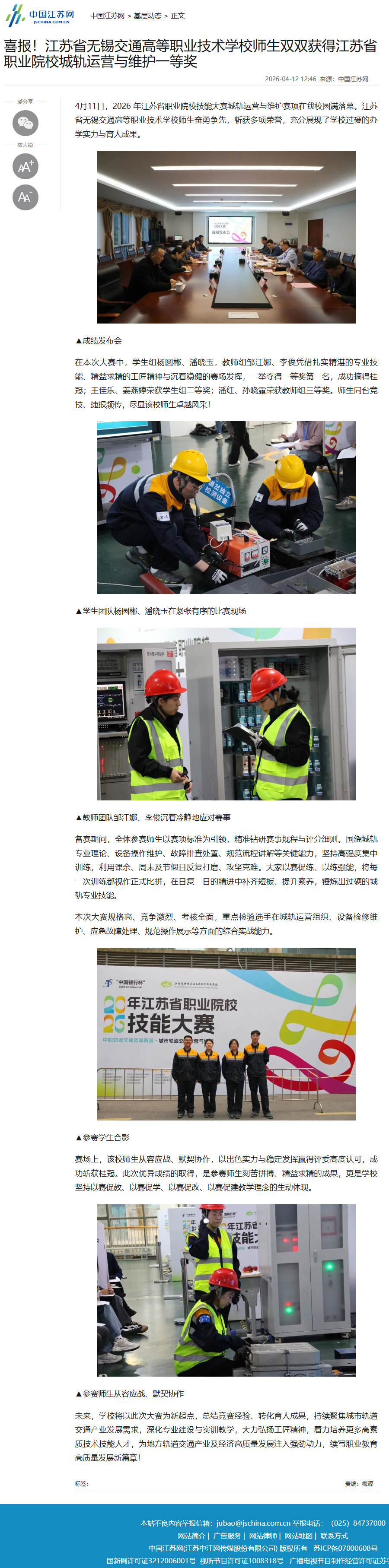 中江网:喜报!江苏省无锡交通高等职业技术学校师生双双获得江苏省职业院校城轨运营与维护一等奖