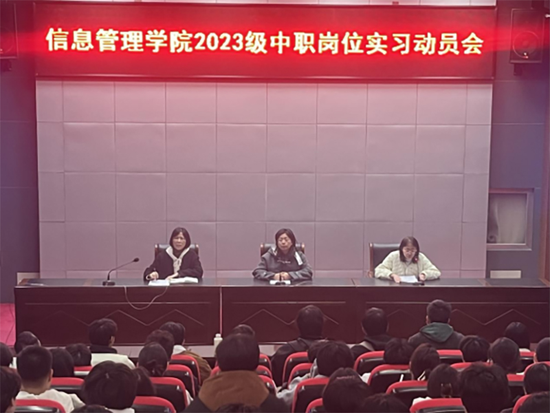 为切实做好23级中职班级学生岗位实习工作,帮助学生明确实习目标、规范实习行为、强化安全意识。11月17日,信息管理学院召开23中职班级岗位实习动员大会。本次大会由学院副院长陈妍主持,党总支书记蒋红梅、副院长姜磊及23级中职全体学生参加。