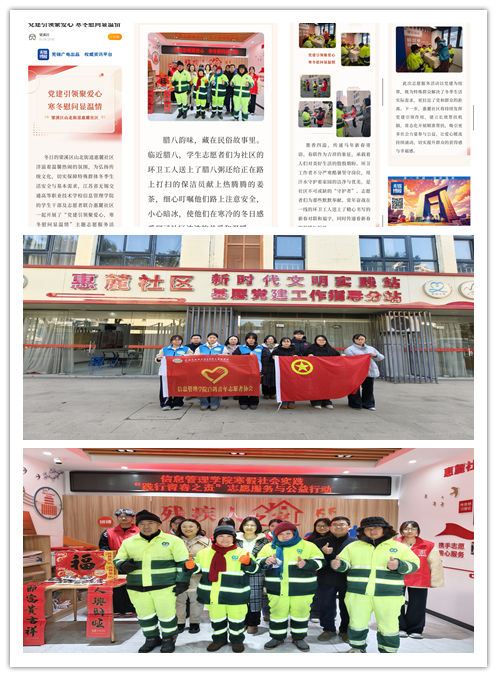 为落实寒假社会实践“践行青春之责”志愿服务要求,1月23日,信息管理学院党总支书记蒋红梅、团总支书记、白鸽青年志愿者协会指导老师朱沛、团总支组织委员王得雪带领十余位学生志愿者,走进梁溪区山北街道惠麓社区,开展“党建引领聚爱心,寒冬慰问显温情”公益志愿服务,相关事迹获无锡博报专题报道。
