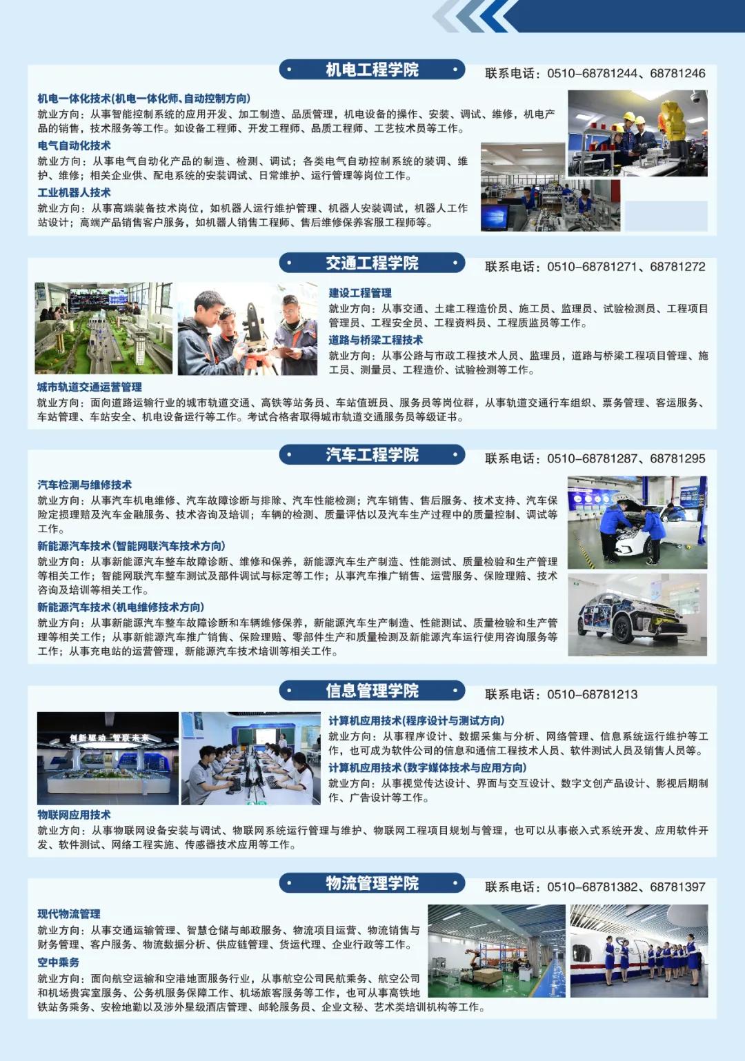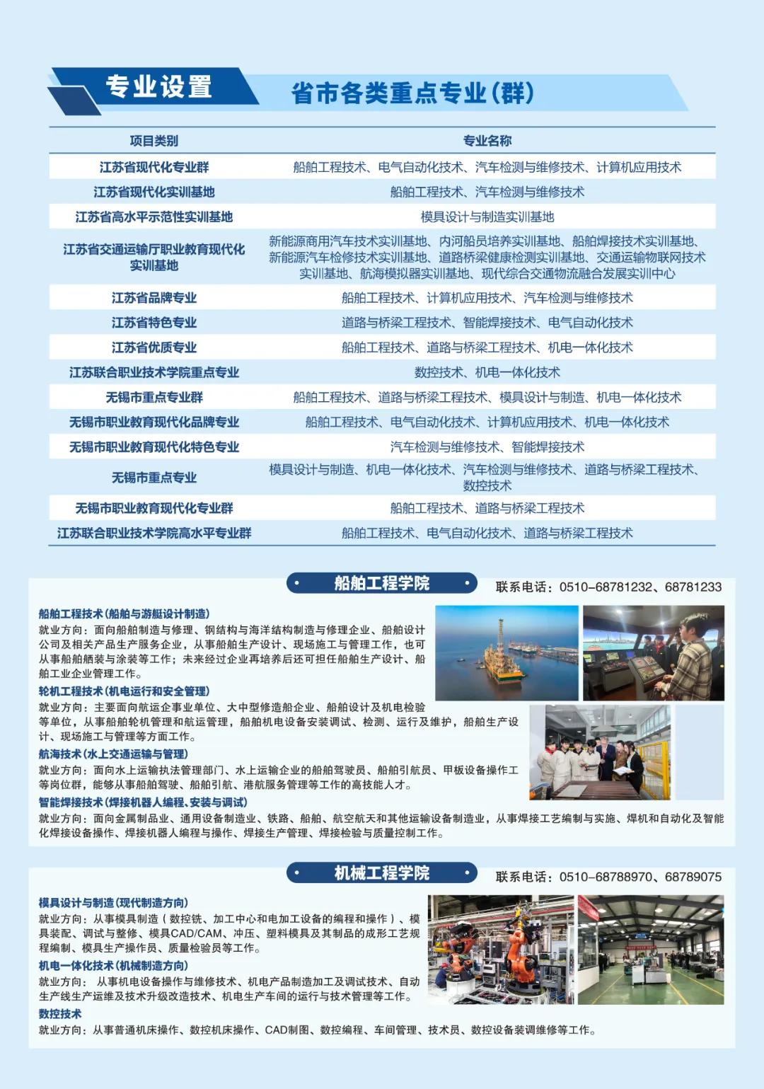 学校坚持立足交通行业、服务地方产业,服务交通运输现代化示范区建设和无锡“465”现代产业体系。围绕交通基础设施建设管理,开设路桥、轨道、建设工程等专业;围绕交通运载工具的设计制造管理使用,开设船舶、汽车、航空、物流等专业;围绕地方现代产业体系建设,开设工业机器人、数控、模具、计算机等专业。现有18个五年制高职专业,21个中职专业。建成省高水平专业群1个,省现代化专业群4个,省优质专业3个,省品牌特色专业6个,船舶智能焊接技术立项为江苏省职业教育技艺技能传承创新平台。