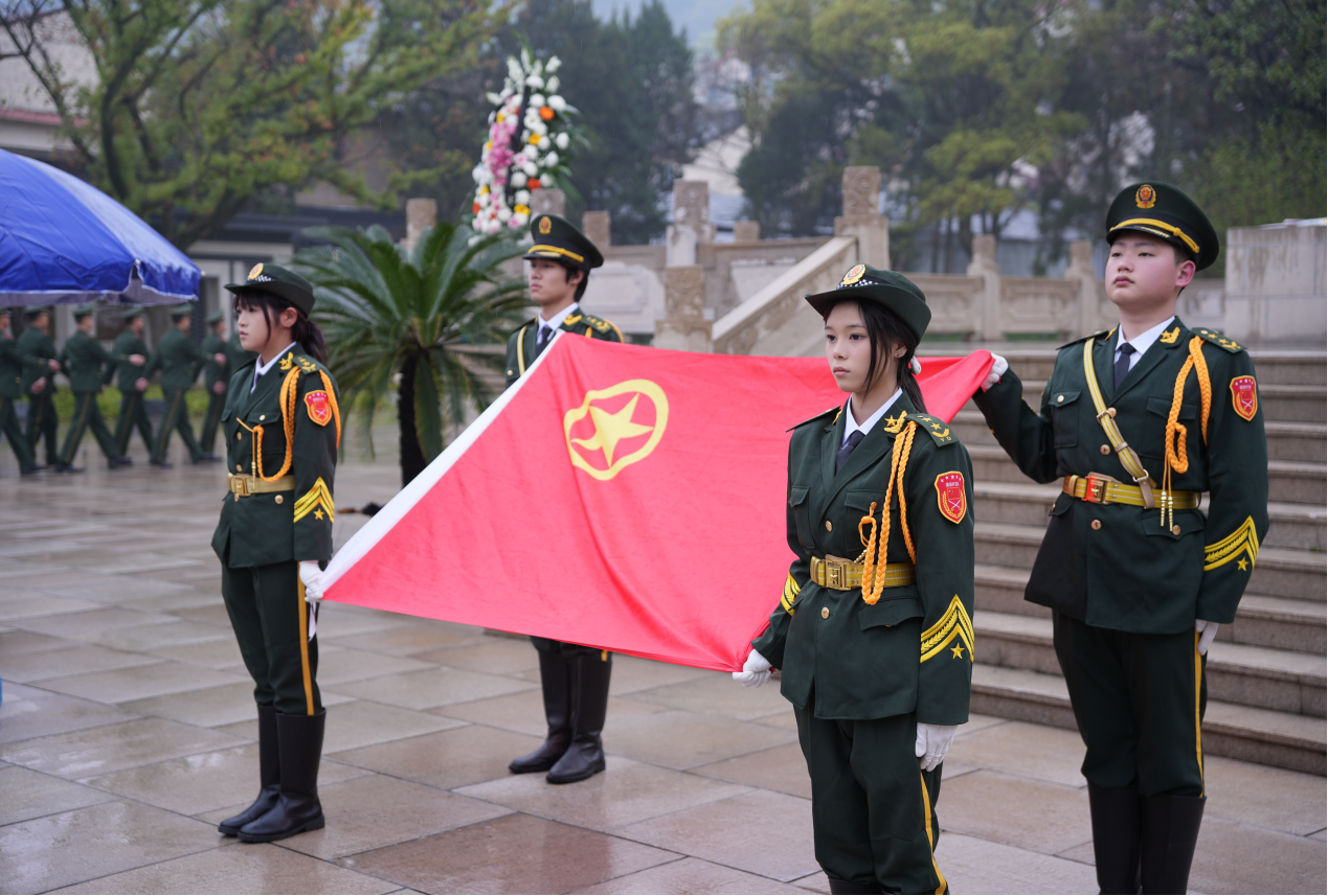 下午3时许,春雨朦胧,气氛肃穆,全体团员青年整齐列队,神情庄重。国旗班队员迈着铿锵有力的步伐,向烈士敬献花圈,全体人员肃立默哀一分钟,深切缅怀为民族独立、人民解放和国家富强英勇献身的革命先烈。